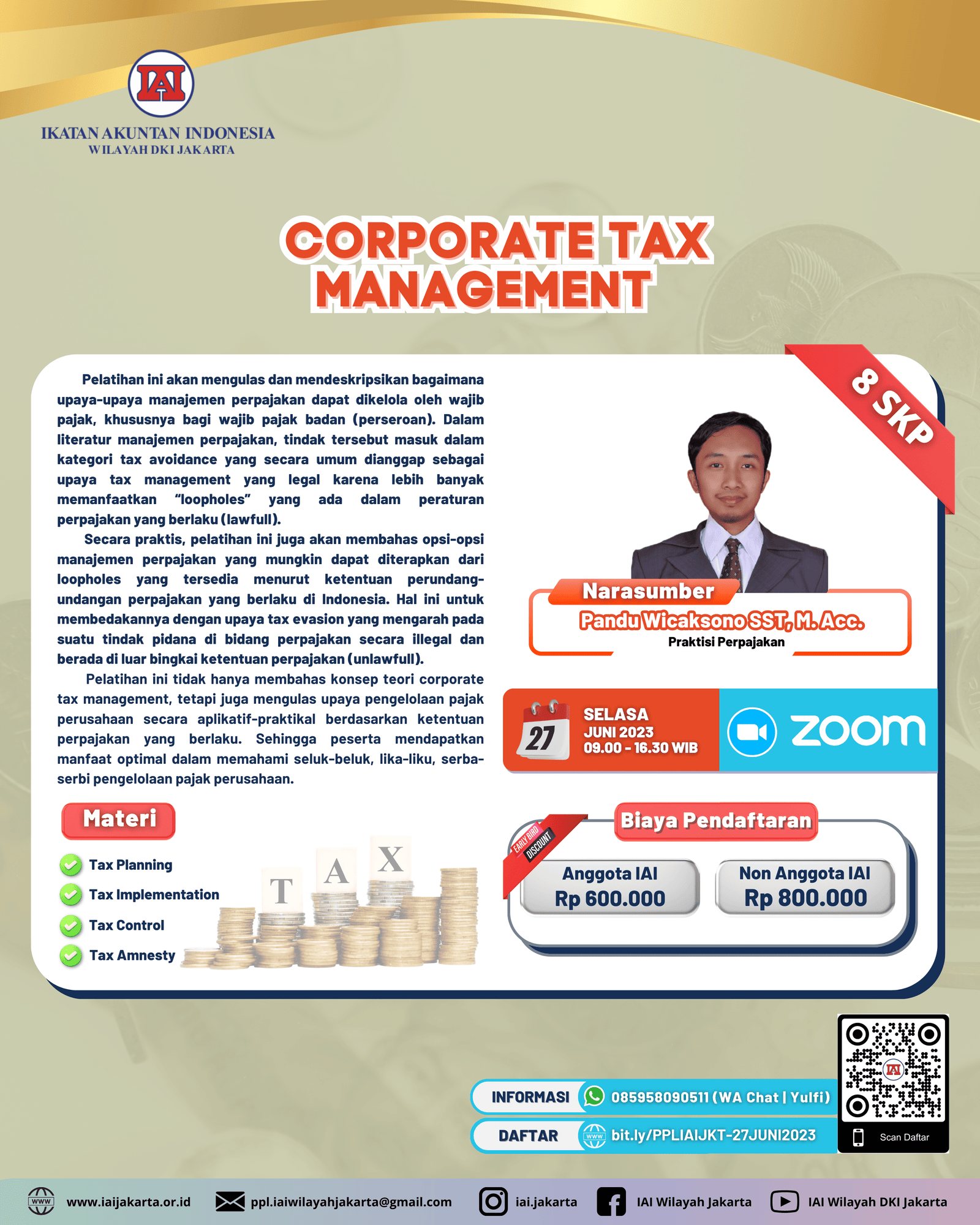 Pelatihan ini tidak hanya membahas konsep teori corporate tax management, tetapi juga mengulas upaya pengelolaan pajak perusahaan secara aplikatif-praktikal berdasarkan ketentuan perpajakan yang berlaku. Sehingga peserta mendapatkan manfaat optimal dalam memahami seluk-beluk, lika-liku, serba-serbi pengelolaan pajak perusahaan.