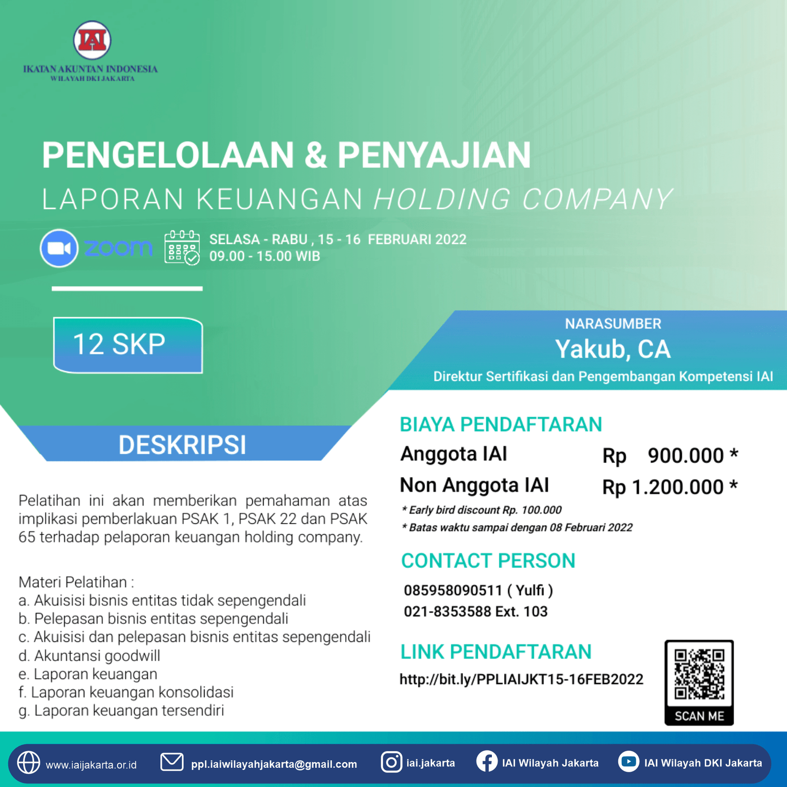 Pelatihan ini akan memberikan pemahaman atas implikasi pemberlakuan PSAK 1, PSAK 22 dan PSAK 65 terhadap pelaporan keuangan holding company.