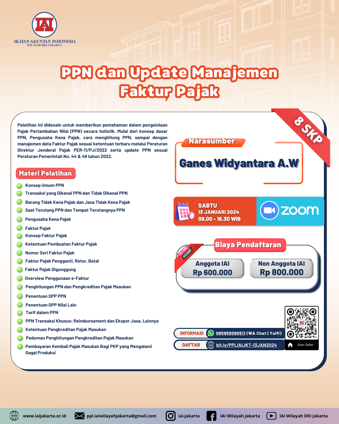 Pelatihan ini didesain untuk memberikan pemahaman dalam pengelolaan Pajak Pertambahan Nilai (PPN) secara holistik. Mulai dari konsep dasar PPN, Pengusaha Kena Pajak, cara menghitung PPN, sampai dengan manajemen data Faktur Pajak sesuai ketentuan terbaru melalui Peraturan Direktur Jenderal Pajak PER-11/PJ/2022 serta update PPN sesuai Peraturan Pemerintah No. 44 & 49 tahun 2022.